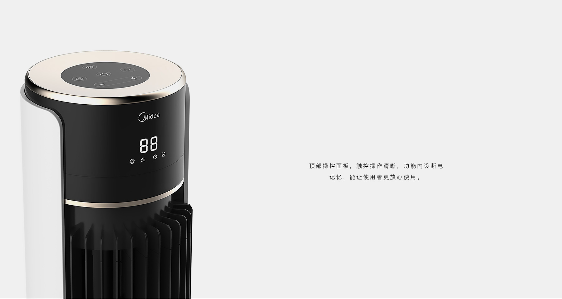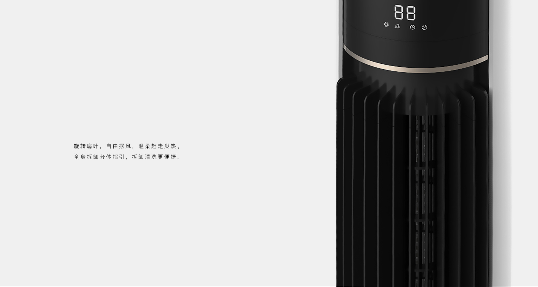 旋转扇叶,自由摆风,温柔赶走炎热。全身拆卸分件指引,拆卸清洗更便捷。 顶部操控面板,触控操作清晰,功能內设断电记忆,能让使用者更放心使用。
